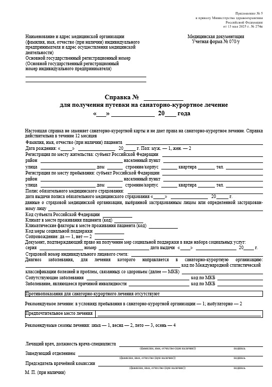 Направление на бесплатное санитарно-курортное лечение выдают именно на основании медсправки 070/у, указывая: